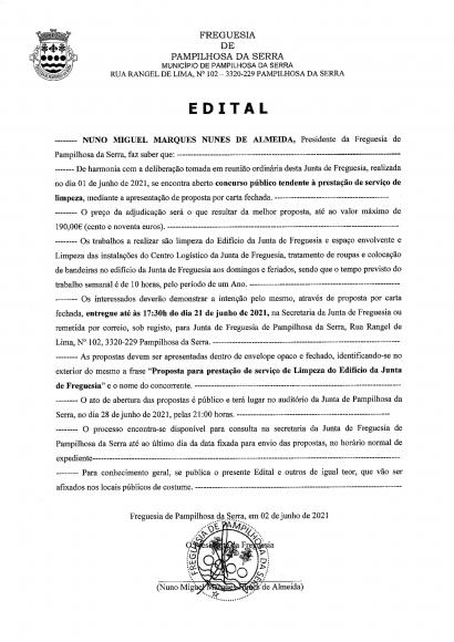 02-JUN-2021Encontrasse aberto o concurso público para a prestação de serviço de limpeza.