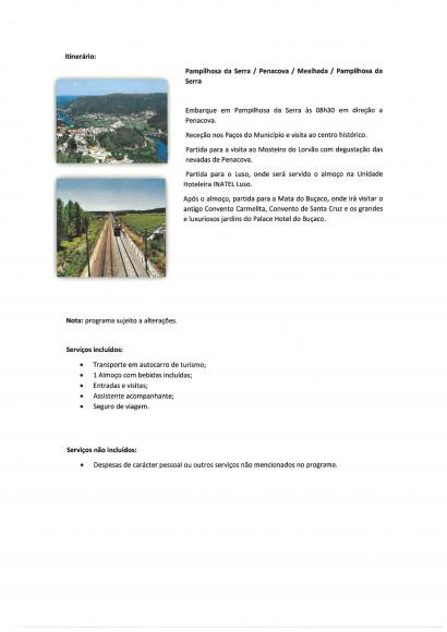 14-MAR-2019O Município de Pampilhosa da Serra em articulação com a Fundação INATEL, esta a organizar a visita à Serra do Buçaco, no dia 29 de março de 2019, destinada a população com mais de 60 anos.Esta visita tem o seguinte programa: Visita ao Mosteiro de Lorvão, Serra do Buçaco, Convento Carmelita e de Santa Cruz e almoço na Unidade Hoteleira Inatel Luso – com o custo de 15€ por participante.Quem estiver interessado deve dirigir-se á secretaria da Freguesia de Pampilhosa da Serra ou entrar em contato através do numero 235594304.